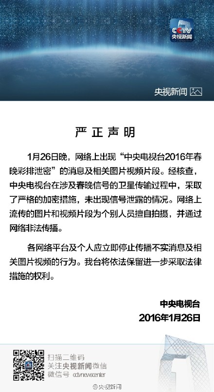 - 央视回应春晚彩排泄密:信号未泄露2016-01-27 06:30:00
